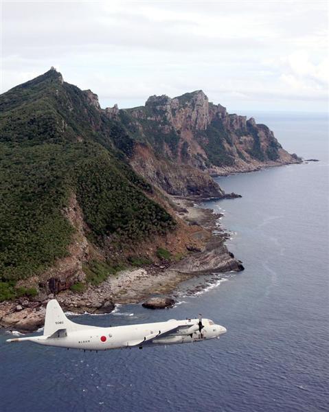 尖閣諸島の魚釣島周辺を飛ぶ海上自衛隊の哨戒機P-3C=平成23年10月13日、沖縄・東シナ海上空(鈴木健児撮影)