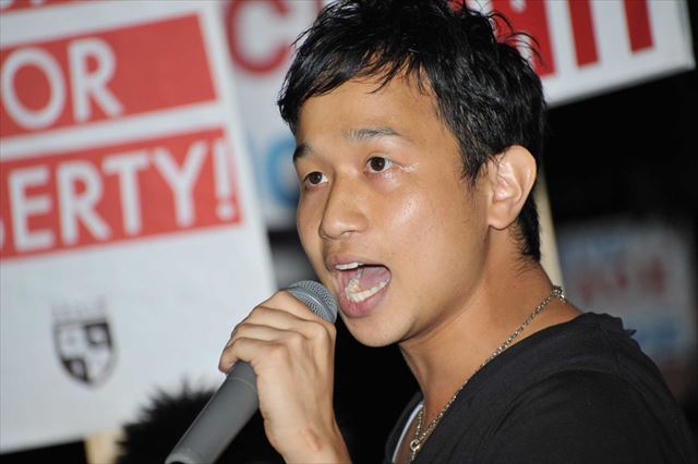 2015年8月28日に行われた「SEALDs」主催の金曜国会前抗議。この日、はるばる福岡県から上京した西南学院大学3年の後藤宏基さんは、「どうしても言いたいことがある」と初めて訪れたという国会前でマイクを取った。