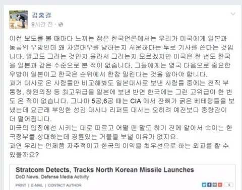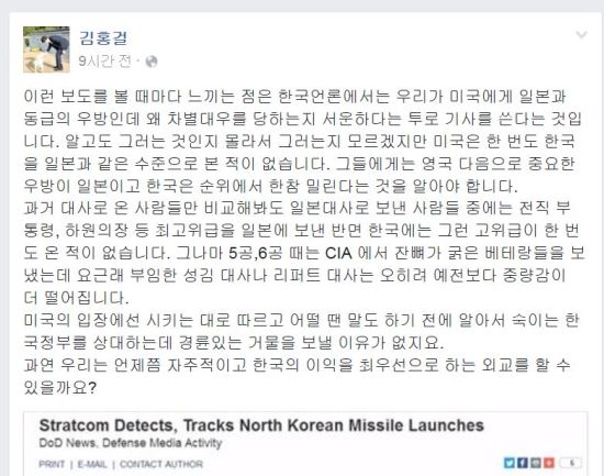 金弘傑(キム・ホンゴル)元共に民主党統合委員長は26日、自身のフェイスブックを通じて「こういう報道を見るたびに感じるのは、韓国メディアが私たちは米国にとって日本と同等の友邦なのに、なぜ差別待遇にあうのか空しい、という内容の記事を書くことです」といった。