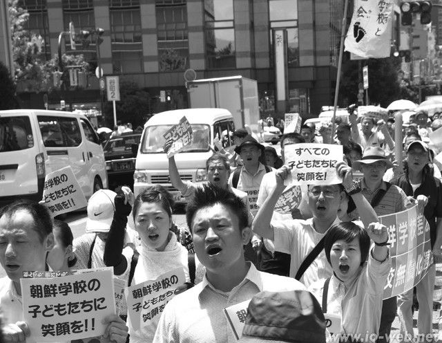 広場を出発したデモの列は、横断幕を掲げ、音楽を鳴らしながら進んでいく。「多くの人々はまだ朝鮮学校のことを知りません。しかしそこに通う子どもたちは、私たちと同じ市民です。子どもたちだけが政治の道具にされています」。