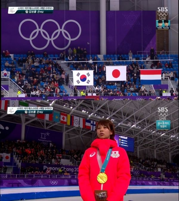 メダル授与式を中継したSBSは同日、マススタート決勝戦で優勝した高木菜那が金メダルを受け取るときに流れた君が代をそのまま編集せずに放送した。