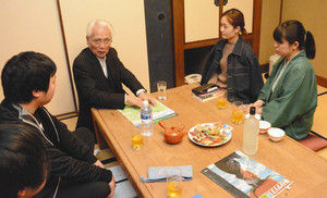 事件当時、警察や報道機関の宿舎になった翠紅苑の現経営者、望月孝之さん(右から3人目)に話を聞く学生たち=14日、静岡県川根本町で