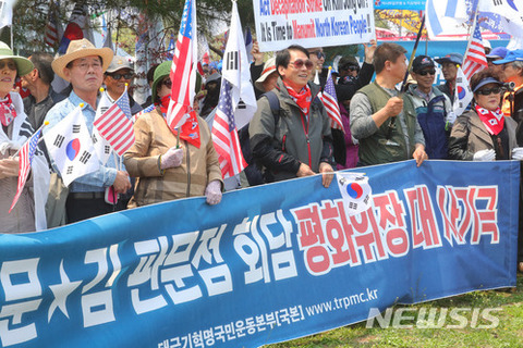 南北首脳会談の翌日である28日、保守団体がソウル中心部の各所で集会を開き、「南北首脳会談は偽装平和戦術」と批判した。
