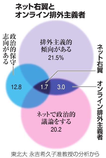 「ネット右翼」はどのくらいいて、どのような人たちなのか。その実像に迫ろうと、8万人規模の過去に例のない大規模調査が行われた。ネット右翼と呼べる人たちは全体の1・7%だったほか、これまで語られてきたネット右翼像とは異なるタイプの「オンライン排外主義者」が3・0%存在することも浮かび上がった。