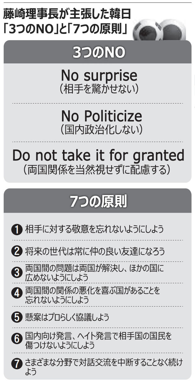 藤崎理事長はまた、韓日関係の話題になると、インタビュー中に自身が最近構想を練ったという「両国が守るべき7つの原則」を提示して説明した。その原則とは「①相手に対する敬意を忘れないようにしよう ②将来の世代は常に仲の良い友達になろう ③両国間の問題は両国が解決し、ほかの国に広めないようにしよう ④両国間の関係悪化を喜ぶ国があることを忘れないようにしよう ⑤懸案はプロらしく協議しよう ⑥国内向け発言、ヘイト発言で相手国の国民を傷つけないようにしよう ⑦さまざまな分野の対話交流を中断することなく続けよう」の7つだ。