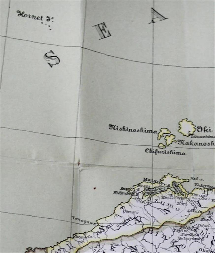 ▲竹島を日本領と認識し1880年に作られたドイツ製日本地図。左上の英語名「ホーネット島」の文字の下にある複数の点が竹島