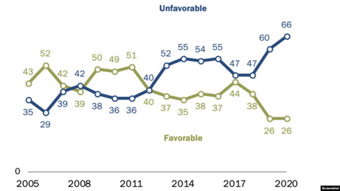 調査対象となった米国人の約66%は、中国に対して否定的な見方を示した。これは、同センターが2005年に調査を始めて以来最も高い水準となった。