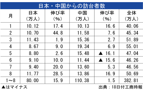8月は低迷していた中国人客も2けた成長を遂げた。今年4月に有名観光地の阿里山で鉄道事故が起きたことを機に減少に