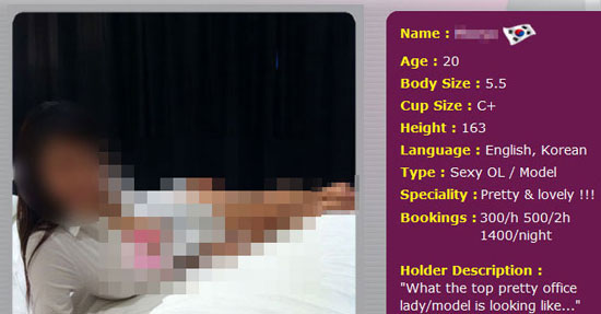 この業者には韓国人女性もいる。 17日に該当サイトを確認したところ、ほとんどが中国人女性で、香港と韓国の女性が1人ずついた。